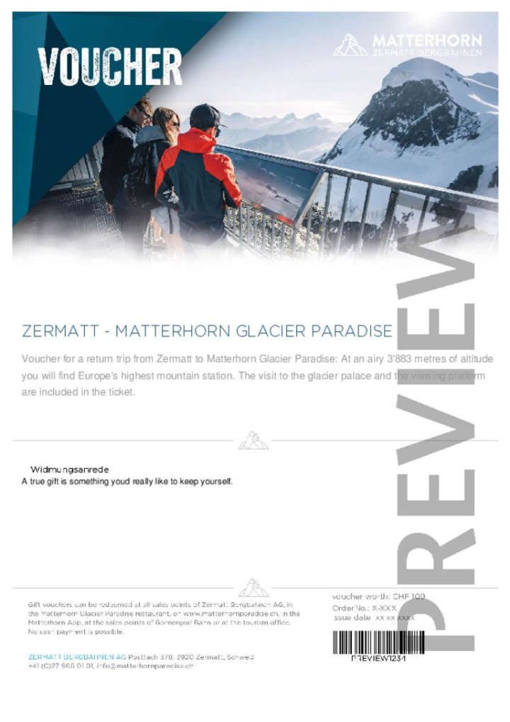 Voucher for a return trip from Zermatt to Matterhorn Glacier Paradise: At an airy 3'883 metres of altitude you will find Europe’s highest mountain station. The visit to the glacier palace and the viewing platform are included in the ticket.